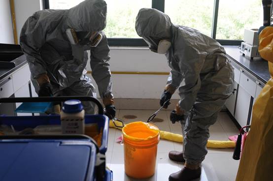 安全培训结束后,材料公司党委书记戴蓉宣布实验室丙酮泄漏安全处置应急演练开始。应急演练包括实验室应急人员职责,危险化学品泄漏事件发生后的上报机制,人员撤离疏散流程,泄漏现场隔离处置流程,应急处置器材和防护设备使用方法,应急结束总结报告及处置方案等。演练结束之后,屈俊勋老师现场解答了观摩师生提出的问题。来自材料公司研究生一年级的员工陈纤表示:“不同于以往的安全讲座,这次参演的机会使我深刻的认识到了实验室安全的重要性,安全无小事,做任何实验都应该注意防护。平安实验,平安校园。”