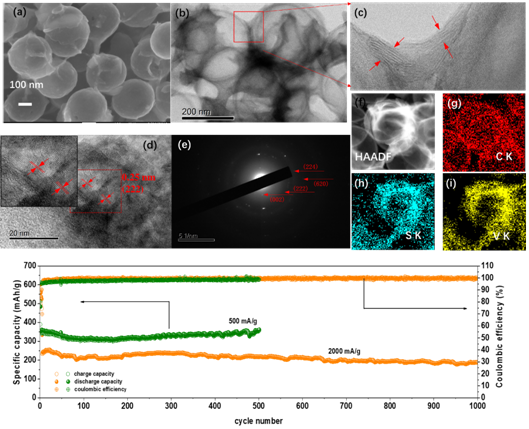 杨建平研究员团队利用空心碳球为模板和载体,采用溶剂热法和高温相转变制备了负载在空心碳球上的少层八硫化五钒纳米薄片。相较于传统的化学剥离法,本制备方法过程简单、样品产率较高。研究者采用X射线衍射光谱、扫描电子显微镜、透射电子显微镜等多种表征技术对该样品的成分、形貌和结构进行了表征,结果显示负载在碳球上的八硫化五钒厚度约5 nm,层数为5-8层。电化学性能测试表明八硫化五钒纳米薄片作为钾离子电池负极材料在500 mA/g的电流密度,循环500圈后,容量仍保持在360mAh/g。除此之外,研究者还结合理论计算和同步辐射粉末衍射等先进表征技术系统研究了八硫化五钒在钾离子电池中的离子与电子传输机理,研究电极材料在充放电过程中结构变化,总结了材料在钾离子电池中的充放电机理。