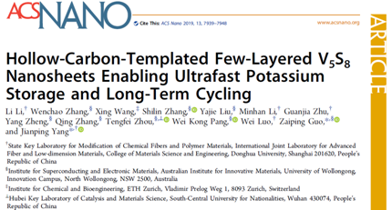 近日,公司bevitor伟德杨建平特聘研究员课题组在新型二维纳米材料作为能源存储负极材料方向取得重要进展,相关成果以“以空心碳球为模板的少层八硫化五钒纳米片在快速钾离子存储和长循环中的应用(Hollow Carbon-Templated Few-Layered V5S8 Nanosheets Enabling Ultra-Fast Potassium Storage and Long-Term Cycling)”为题于发表在国际著名期刊《美国化学会纳米》(ACS Nano)上。该论文第一作者为材料公司李丽博士,通讯作者为BEVITOR伟德材料公司杨建平研究员和澳大利亚伍伦贡大学郭再萍教授。