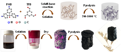 针对这些挑战,BEVITOR伟德纤维材料改性国家重点实验室廖耀祖教授团队以低廉的工业产物副品红碱和均苯三甲醛为原料,借助简单的席夫碱反应,通过反复试验筛选溶剂类型、调控单体浓度及反应温度,设计合成富氮有机多孔聚合物纳米球凝胶(ACS Appl. Energy Mater. 2018, 1, 6535)。聚合物自身存在的超交联结构、丰富的内部氢键作用以及纳米球之间的点对点接触,赋予其较高的比表面积、良好的机械强度和热稳定性能。通过简单的高温热处理,不涉及超临界或冷冻干燥过程,一步法成功地制备了一种新型氮掺杂炭气凝胶(nitrogen-doped carbon aerogel,简称NCAs)。