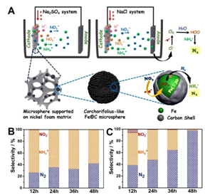(图2. CL-Fe@C电催化脱氮的机理图和产物选择性分布)