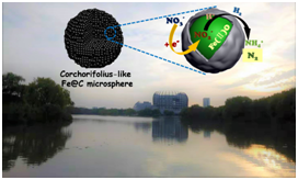 针对这一问题,研究团队选取Fe3O4胶体纳米晶作为构筑单元,以自组装策略制备的Fe3O4超结构微球为前驱体,经过配体碳化以及热还原处理得到具有高铁含量的山莓状碳包覆零价铁组装微球(CL-Fe@C)作为阴极材料。电催化反硝化脱氮性能评价结果表明,CL-Fe@C在具有优异的抗氧化稳定性的同时对硝酸根的转换率接近100 %,N2的选择性接近98%。CL-Fe@C对实际水体中的硝酸根依旧表现出有优异的催化性能,硝酸根的转化率和氮气的转化率分别达到~52 %和44 %。