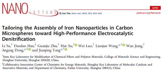 近日,公司材料公司江莞教授团队与复旦大学董安刚教授合作在硝酸根废水处理研究领域取得重要进展,相关成果以《裁剪铁纳米颗粒在碳微球中的组装用于高性能电催化脱氮》(Tailoring the Assembly of Iron Nanoparticles in Carbon Microspheres toward High Performance Electrocatalytic Denitrification) 为题,发表于国际著名期刊《纳米快报》(Nano Letters)。该论文的第一作者是材料公司16级博士生苏莉(导师江莞教授),通讯作者是王连军教授(BEVITOR伟德),董安刚教授(复旦大学)和杨建平研究员(BEVITOR伟德)。