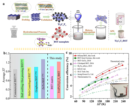图1. a) Ti3C2Tx/BST热电材料的制备流程示意图, b) 平均ZT以及c) 热电转化效率图