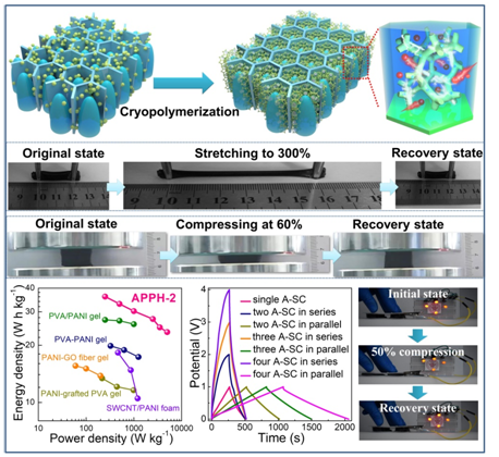 鉴于此,刘天西团队提出了冷冻聚合新策略实现了苯胺单体在冷冻条件下的原位聚合反应,一步实现了聚乙烯醇蜂窝状凝胶网络和聚苯胺三维凝胶网络的纳米复合和高效界面作用,获得了高强高韧的聚乙烯醇-聚苯胺复合水凝胶材料。如图所示,冷冻聚合策略利用溶解有苯胺单体和引发剂分子的聚乙烯醇水溶液为前驱体,采用单向冷冻技术以冰为模板将聚乙烯醇组装成蜂窝孔结构,再经过苯胺单体的冷冻聚合过程得到了聚乙烯醇-聚苯胺复合水凝胶。该聚乙烯醇-聚苯胺复合水凝胶经过多次300%拉伸应变、60%压缩应变和全弯曲过程,均可轻易回复至初始形状,同时具有高强度和耐复杂形变能力。冷冻聚合策略在构建聚乙烯醇-聚苯胺复合水凝胶微观结构调控上颇具特色,该复合水凝胶由取向结构聚乙烯醇微孔道和三维连续的聚苯胺纳米骨架构成。三维连续的聚苯胺纳米骨架为电子传导提供了快速通道,而取向结构聚乙烯醇微孔道和聚苯胺纳米骨架所构成的双连续凝胶网络结构显著改善了电解液的离子扩散动力学过程。基于该聚乙烯醇-聚苯胺复合水凝胶的全固态超级电容器具有高比容量、高能量密度和优异的循环性能,在复杂形变条件下仍可维持稳定的电化学性能。