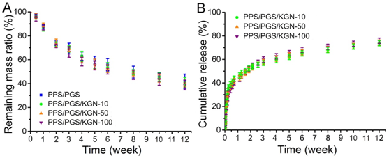 图2支架体外降解和生物活性分子KGN的缓释