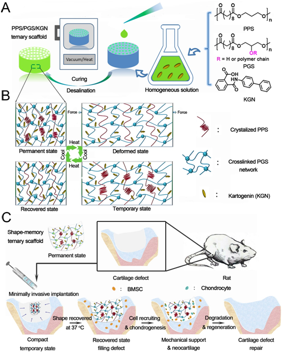 该多孔支架是由一种促进软骨再生的生物活性小分子KGN、生物弹性体聚癸二酸甘油酯(PGS)和聚(1,3-丙二醇甘油酯)(PPS)杂化构筑。其中PGS是该团队长期研究的一种应用广泛的生物相容和生物可降解弹性体,其形成共价网络,可以根据缺损部位形状,定制支架的永久形状。结晶的PPS链段作为可逆开关相起到固定临时形状的作用。相较于传统的聚合物生物材料聚乳酸(PLA)、聚己内酯(PCL)等,PGS一个特点是有大量的自由羟基,可以进行多种化学修饰,方便地实现功能化。本工作中接枝了生物活性的小分子KGN,赋予了支架促进软骨再生的能力。