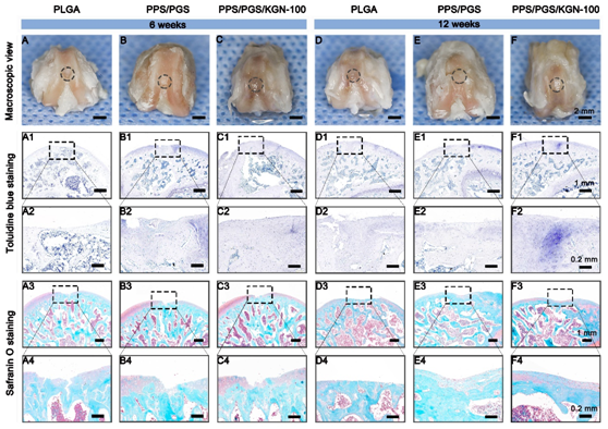 上述PPS/PGS/KGN支架,在体外实验中可促进骨髓间充质干细胞生长和向软骨分化;在体内实验中,无需外源生长因子和细胞,成功修复大鼠股骨髁软骨缺损(图4)。
