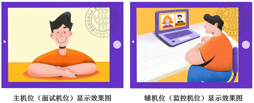 复试前按要求调试好设备,开启摄像头,主机位(面试机位)从正面拍摄,对准考生本人,确保考生双手和头部完全呈现在拍摄画面中。辅机位(监控机位)从考生侧后方45°拍摄,距离1-2米,确保辅机位能从侧后方清晰显示考生上半身及复试环境,复试专家组能够从辅机位清晰看到主机位屏幕。屏幕显示效果图如下。