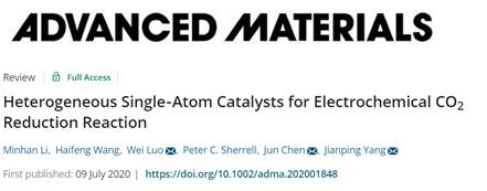近日,公司材料公司杨建平研究员和罗维研究员团队在CO2电催化还原领域取得重要进展,相关成果以《非均相单原子催化剂设计用于CO2电催化还原》 (Heterogeneous Single‐Atom Catalysts for Electrochemical CO2 Reduction Reaction, https://onlinelibrary.wiley.com/doi/full/10.1002/adma.202001848)为题,发表于国际知名期刊《先进材料》(Advanced Materials, 2020, 2001848),该论文第一作者是材料公司18级博士生李民瀚,合作者包括19级博士生王海凤,罗维研究员(通讯作者),澳大利亚墨尔本大学Peter C. Sherrell博士,澳大利亚伍伦贡大学陈俊教授(通讯作者)和杨建平研究员(通讯作者)。