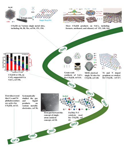 热力学上,CO2RR的主要还原产物的半反应的还原电势与HER反应接近。然而,CO2分子难以活化,还原过程又涉及多步电子转移过程造成了较低的CO2RR反应动力学。因此,开发高效的电催化剂是提高CO2RR反应活性和选择性的关键。单原子催化剂(SACs)成为催化领域的前沿研究,在多种催化反应过程中表现出优异的性能。目前,已有多种单原子金属催化剂被应用于CO2RR,并且得到了以CO为主的多种还原产物。