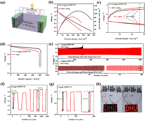 由于Co9S8纳米粒子与HPCNF之间的协同作用,较高的比表面积、多孔和中空结构、N和S的掺杂以及良好的导电性,制备出来的Co9S8-NSHPCNF对ORR和OER同时表现出优良的催化性能和耐久性。以Co9S8-NSHPCNF为空气阴极组装的锌空气电池放电峰值功率密度(113 mW cm-2)高于Pt/C (80 mW cm-2),循环稳定性优良(图2)。