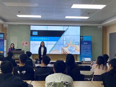 首先,通过视频放映的形式以及利健文总监ppt讲解的形式介绍了雷帝(中国)建筑材料有限公司的情况、公司的性质、发展历史、运营模式以及公司产品的应用价值和应用方向。之后,陆佳敏总监对雷帝公司的企业文化、使命、愿景及核心价值观做了详细的说明,后续的应届生人才培养方式的讲述更激起了同学们极大的兴趣。紧接着,陆佳敏总监邀请就职于雷帝公司的东华员工分享就职体验与感想,介绍工作心得、岗位内容以及公司部分产品概况,旨在吸引即将毕业的“新鲜血液”。在现场答疑环节,陆佳敏总监对同学提出的“试用期薪资”、“毕业生落户政策”、“是否会存在加班,加班薪资发放”、“后续面试安排”“岗位晋升”等问题进行详细解答,帮助同学更深入的了解公司内部机制和运营模式。
