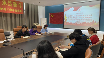 微党课中,四位党员教师还讲述了无数东华人努力奋斗在抗疫一线的鲜活事例。他们践行“停课不停学”,日夜打磨优质线上课程,他们迎难攻坚,勇敢攀登科学技术高峰。抗疫中没有旁观者,党员们到基层去,不忘初心,行稳致远。