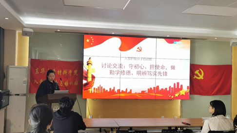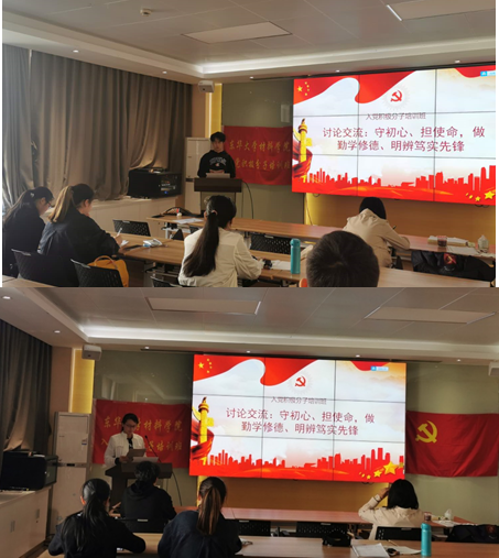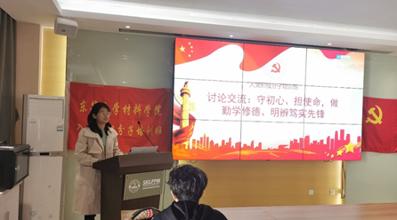 首先,班长张诗喆就“守初心、担使命,做勤学修德、明辨笃实先锋”主题组织这场交流会。她结合了现实环境与自身实际,引用了上一节课的视频的部分内容为大家分享经验,深深地引发了大家的思考。