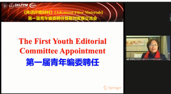 此次Advanced Fiber Materials 期刊共计聘任40位青年编委,有英国曼彻斯特大学的刘旭庆教授、美国普渡大学的李恬助理教授、上海交通大学的冯传良教授等来自国内外纤维及纤维跨学科领域的青年学者和行业专家。会上,期刊主编朱美芳教授进行第一届青年编委线上聘任,并为首届青年编委会的成立发表视频讲话,对青年编委会的成立表示热烈的祝贺,向受聘专家、学者表示热烈的欢迎,并对年轻学者寄予厚望,希望通过此次青年编委会的成立,团结国内外交叉学科优秀的青年科学家,将《先进纤维材料》办成国际一流学术期刊,成为发布纤维基础领域研究及其多功能应用科研成果和交流学术思想的重要阵地!同时呼吁年轻人在国际上多发声多交流,坚持四个面向,用纤维创造美好生活!
