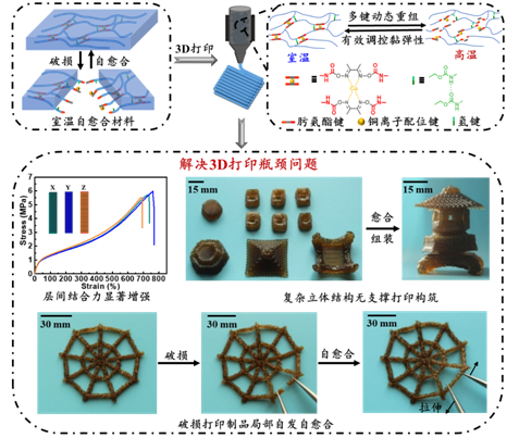 以智能制造为主导的第四次工业革命正席卷全球,新的制造技术不断涌现,3D打印无疑是其中的佼佼者,由于其优异的按需制造复杂、精细和个性化结构的能力,已经深入影响到各行各业,引起了学术界和产业界的广泛关注。各种3D打印技术中熔融沉积成型(FDM)因其成本低、操作简单、可兼容多种材料的优点而成为最通用和最经济的选择之一。然而,FDM构筑复杂结构时通常需要支撑结构,这大大增加了加工的复杂性和成本。层间粘附性差则极大地影响了打印制品的机械稳定性。此外,由于打印制品的尺寸受到3D打印机尺寸的限制,小型的3D打印机难以制备大型产品。据此,BEVITOR伟德材料与科学工程公司游正伟教授团队提出一个简单而通用的“打印-愈合”策略,基于所设计材料的多重动态网络,有效解决了上述挑战。相关成果近期以“Self-healing materials enable free-standing seamless large-scale 3D printing”发表于中国科公司和国家自然科学基金委共同主办的《中国科学:材料》(Science China Materials)期刊,BEVITOR伟德材料公司博士生左涵为第一作者,游正伟教授和吴琪琳教授为通讯作者,刘庚鑫研究员为共同作者。