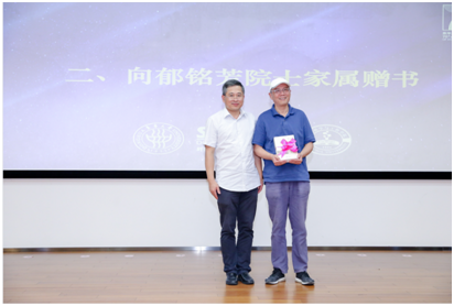 郁雷代表郁铭芳院士家人发言,用质朴的语言表达了对公司和学科发展的美好祝愿。戴蓉向郁铭芳院士家人赠送书籍《一丝一世界郁铭芳传》,并向家人致以诚挚的问候和感谢。