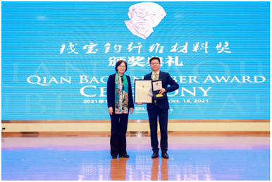 (朱美芳(左)为“钱宝钧纤维材料奖”获奖者颁奖)