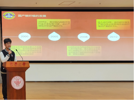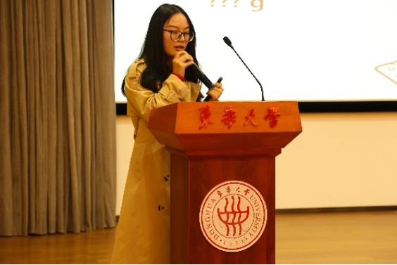 围绕活动主题,同学们还联系实际,以多种形式分享交流了传承东华精神的担当与实践。党员代表刘雨欣分享了大学四年的收获与体会,希望同学们明确目标、保持积极向上心态,为了梦想不断追寻、拼搏。刚刚结束第四届中国国际进口博览会志愿服务的“小叶子”代表,2019级本科生颜赛、胡雅雯分别交流了参与进博会志愿服务的体会,希望更多同学积极参与实践,在实践中坚定理想信念、践行初心使命。纤维材料改性国家重点实验室员工讲解团成员讲述了学科发展历程以及学科奠基人钱宝钧先生“不为一己求安乐、愿做别人嫁衣裳”的奉献精神和高尚品格。