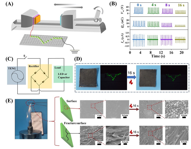图(A)用于驱动电子设备的LCP-TENG示意图;(B) LCPAEE-TENG 分别燃烧4 s、8 s和16 s 后的电输出性能;(C)充电系统电路图;(D)燃烧16 s前后点亮17个LED的照片;(E) LCPAEE燃烧16 s前后表面和内部形态的SEM图。