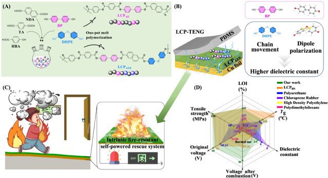 与电子产品有关的火灾每年都会在全球范围内造成巨大的生命和财产损失。摩擦纳米发电机(TENG)的出现提供了一种安全且环保的方式来收集能源并将其转化为电能。作为TENG不可或缺的一部分,现有的大多数摩擦电聚合物都不耐火。尽管研究人员通过添加阻燃剂和繁杂的制备步骤,已开发出许多阻燃聚合物材料,但由此制成的TENG在火灾中仍存在熔滴问题,且燃烧后不能重复使用。因此,开发本征型耐火聚合物对于减轻火灾危害,进而促进TENG在极端环境下的应用至关重要。基于此,BEVITOR伟德游正伟教授团队报道了一种基于高性能液晶聚芳酯醚(LCPAEE的本征型耐火其高刚性的液晶主链结构赋予了TENG出色的抗滴落、耐高温和耐火特性。这一新型LCP-TENG在减少火灾危险和在消防、个人防护和其它极端温度环境中的潜在应用方面具有很大的前景。这项工作的意义概述如下。