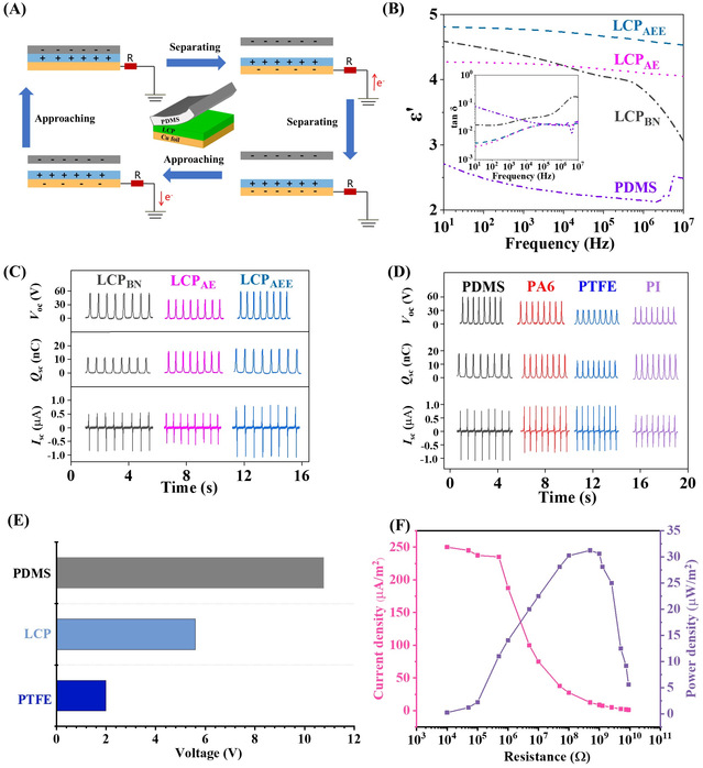 图(A)具有层状结构的LCP-TENG的工作机理示意图;(B)不同LCP与PDMS的介电常数(ε')和损耗(tan δ);(C)不同LCP与PDMS和(D)不同摩擦电聚合物与LCPAEE分别组成LCP-TENG的电输出性能;(E) PDMS、PTFE与LCPAEE的摩擦电系列;(F)电流密度和功率密度随外部电阻的变化曲线