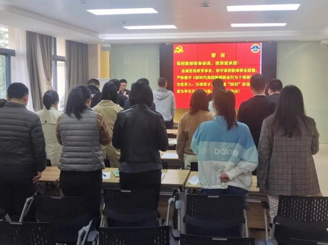 三位优秀教师代表分享交流之后,与会的全体教师签署了师德师风承诺卡,并进行集体宣誓,誓词铿锵有力,与会教师表示要努力做“四有”好老师,为党育人、为国育人。