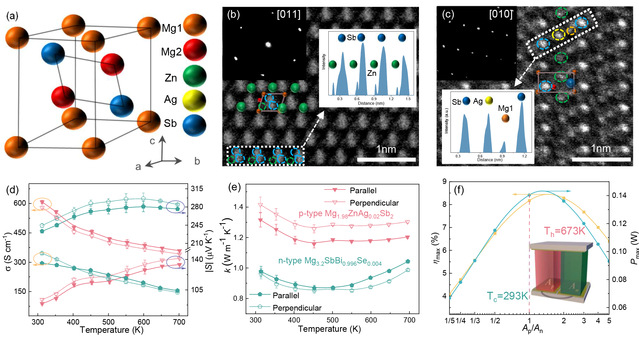 图1 (a, b, c) Mg3Sb2基热电化合物晶体结构及有关原子相结果; (d, e) p/n型Mg3Sb2化合物的热电性能; (f) 器件结构设计。