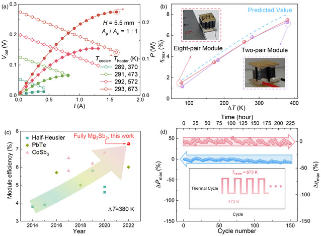 图4 (a) 不同温度下器件输出性能; (b) 两对和八对全Mg3Sb2基热电模块的转换效率; (c)目前同基体热电模块的效率统计; (d) 全Mg3Sb2基热电模块的热循环可靠性评估。