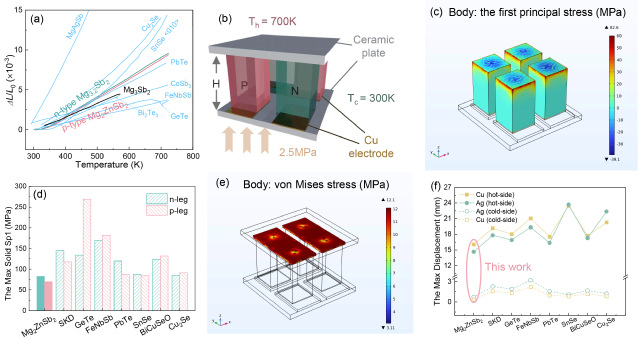 本文首先通过Zn-Ag共掺杂调控p型Mg3Sb2基化合物热电性能,并进行了器件结构优化(图1)。随之获得了与其他p型材料相比更适配于n型Mg3.2Bi0.996SbSe0.004的热膨胀系数(图2a)。进而,利用有限元仿真对包括热电臂、银焊层、铜电极结构的器件进行第一主应力、von Mises应力和最大偏移距离的定量分析,结果表明全Mg3Sb2热电模块具备优异的热力学稳定性。热-电-结构耦合分析阐明了边界条件、热电臂结构要素对热电器件内部应力大小及分布、形变等结构特性的影响规律,为器件集成提供了针对性指导。
