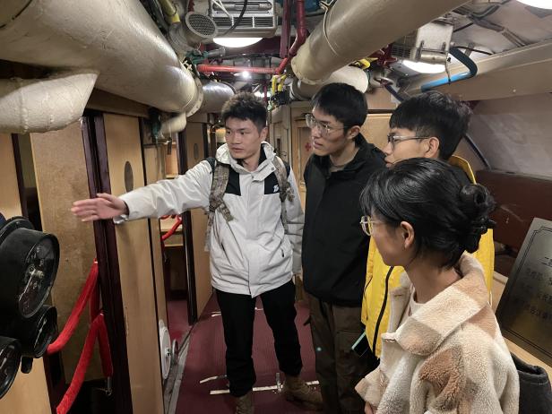 (退役老员工士兵周航在潜艇内向同学们介绍潜艇设施装备)