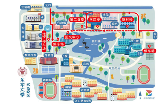 公交:松江客运中心公交站,乘坐松江15路/松江13路至广富林路人民北路,下车后步行约300米到达东门,入校后沿东华大道往西步行400米,可至5号公司楼(材料公司楼);