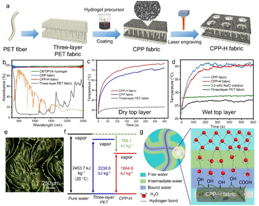 实验结果显示,CPP-H织物的太阳光吸收率显著提升至96.1%,展现出低热损失和优异的光热转换性能(图2),为高效太阳能海水蒸发提供了理想的光热平台。此外,织物表面富含极性官能团,可通过氢键和静电相互作用调控表面水分子状态,从而显著降低水分子“逃逸”所需能量,进一步降低蒸发焓和提升蒸发效率。