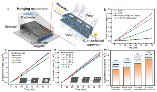 随后,将CPP-H织物斜挂在高海水槽和低空槽之间,组装成向光斜挂蒸发器。高水槽的海水会渗透织物边缘,沿着斜挂织物的底层和顶层流动,实现了从高海水槽向低空槽的海水传输。阳光照射下,织物吸收太阳光并将其转化为热,促使海水在顶层的上表面(平面I)、顶层的下表面(平面II)、底层的上表面(平面III)和底层的下表面(平面IV)四个平面同步蒸发(图1d, 图3)。其中,外平面(I和IV)的蒸汽可直接扩散至大气中,而内平面(II和III)的蒸汽则沿中间层传输,并通过顶层孔阵列扩散至外部环境。CPP-H织物的蒸发模式模拟了植物叶片的蒸腾过程。蒸发后剩余的海水被浓缩为盐水,并滴落至低空收集槽,从而有效避免蒸发器内部盐结晶积累。实验结果表明,该三层光热织物在1.0 kW m-2光照下蒸发速率可达2.6 kg m-2 h-1,性能优于基于类似材料的传统漂浮模型(单平面蒸发,1.6 kg m-2h-1)、单层织物悬挂模型(双平面蒸发,1.9 kg m-2h-1)或三层织物(四平面蒸发无蒸汽通道,2.2 kg m-2h-1)(图3)。