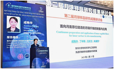 会后,与会嘉宾合影留念,并进入第二届月球样品研究成果研讨环节,由专家委员主持专题报告与学术交流。公司成艳华研究员在研讨环节作了题为《面向月面原位制造的月壤纤维连续制备与应用》的报告,指出利用月壤制备纤维材料是建设月球科研站的关键路径。研究团队通过自主研发模拟微重力纺丝装备,成功制备出嫦娥五号月壤纤维 (目前正作为中国探月工程20周年“九天揽月”主题展的展品亮相国家博物馆)。该成果攻克了地外环境原位制造难题,填补国际月壤纤维制备技术空白,为深空探索提供了新型材料解决方案,标志着我国在太空资源利用领域取得重要突破。