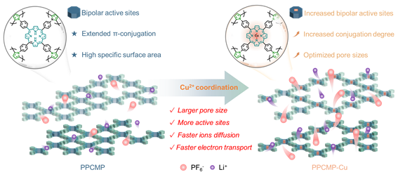 面对多孔电极活性不足的挑战,团队另辟蹊径——用铜离子配位修饰卟啉聚合物(PPCMP-Cu)。铜离子的加入(图四):重塑电子云结构,缩小能带间隙,将离子扩散速度提升38倍,实现702 Wh/kg超高能量密度,5 A/g电流下76秒快充,功率密度超12000 W/kg。“这好比给电池装上了涡轮增压器。”论文共同通讯作者吕伟副研究员表示。该研究为解决电极动力学瓶颈开辟新路径,发表于《化学科学》(Chemical Science, 2025. DOI:10.1039/D4SC08244C)。