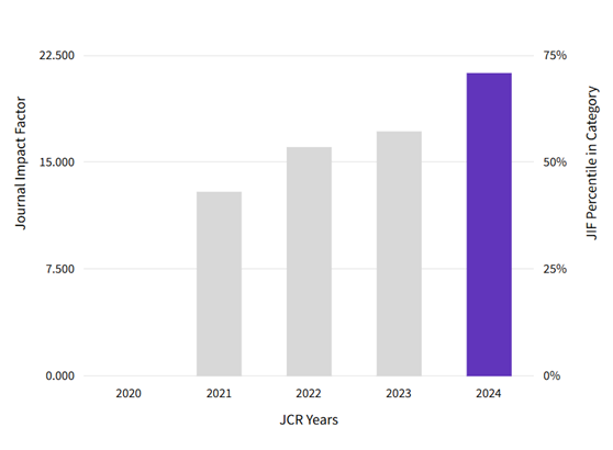 2025年6月18日,科睿唯安发布《期刊引证报告》(Journal Citation Reports,简称JCR),《先进纤维材料(英文)》(Advanced Fiber Materials)期刊的影响因子持续稳步上升,从去年的17.2增长至21.3,影响因子增长近24%,在JCR材料科学(MATERIALS SCIENCE, MULTIDISCIPLINARY) :综合领域排名提升至前5%,处于该领域Q1分区;在材料科学:纺织领域 (MATERIALS SCIENCE, TEXTILES) 中连续4年排名第一。