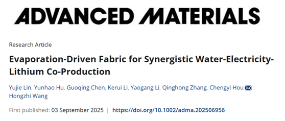 近日,该成果以“Evaporation-Driven Fabric for Synergistic Water-Electricity-Lithium Co-Production”为题,发表在国际期刊《先进材料》(Advanced Materials, 2025, 10.1002/adma.202506956)。论文第一作者为公司硕士生林宇杰和博士生胡云浩,通讯作者为侯成义研究员。